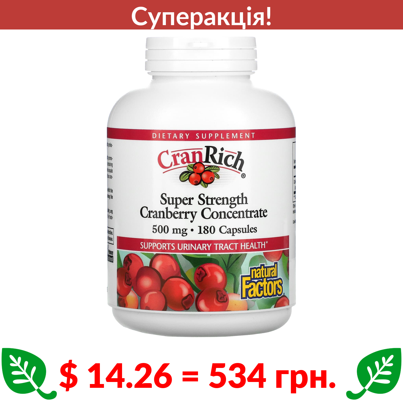$ 14.26 = 534 Π³ΡΠ½. π₯ cΡΠΏΠ΅ΡΠ°ΠΊΡΡΡ! π₯ Natural Factors, CranRich, Super Strength, ΠΊΠΎΠ½ΡΠ΅Π½ΡΡΠ°Ρ ΠΆΡΡΠ°Π²Π»ΠΈΠ½ΠΈ, 500 ΠΌΠ³, 180 ΠΊΠ°ΠΏΡΡΠ»
