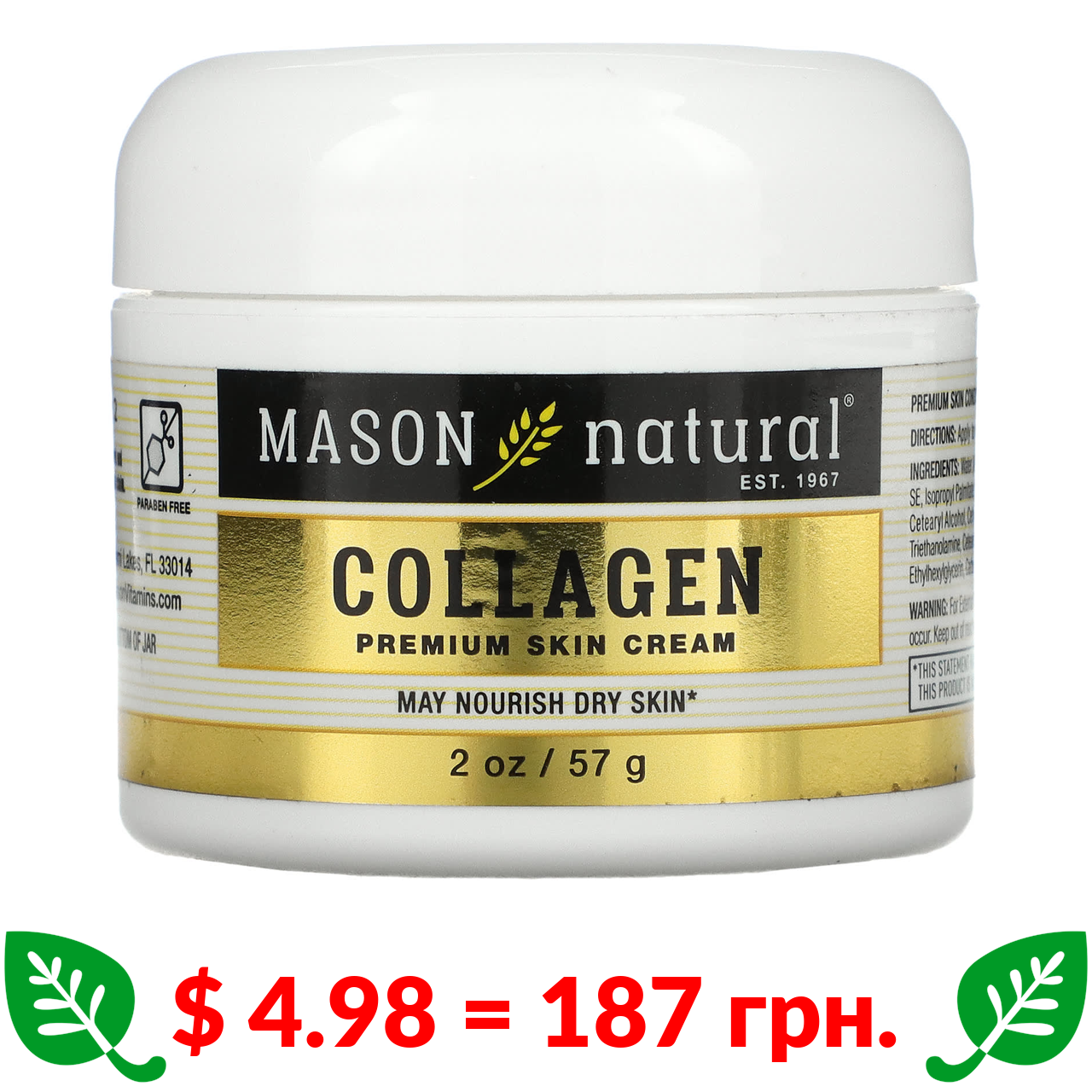 $ 4.98 = 187 Π³ΡΠ½. π️ Ρ ΠΊΠΎΡΠΈΠΊΡ π️ Mason Natural, ΠΊΡΠ΅ΠΌ Π΄Π»Ρ ΡΠΊΡΡΠΈ Π· ΠΊΠΎΠ»Π°Π³Π΅Π½ΠΎΠΌ ΠΏΡΠ΅ΠΌΡΠ°Π»ΡΠ½ΠΎΡ̈ ΡΠΊΠΎΡΡΡ, 57 Π³ (2 ΡΠ½ΡΡΡ̈)