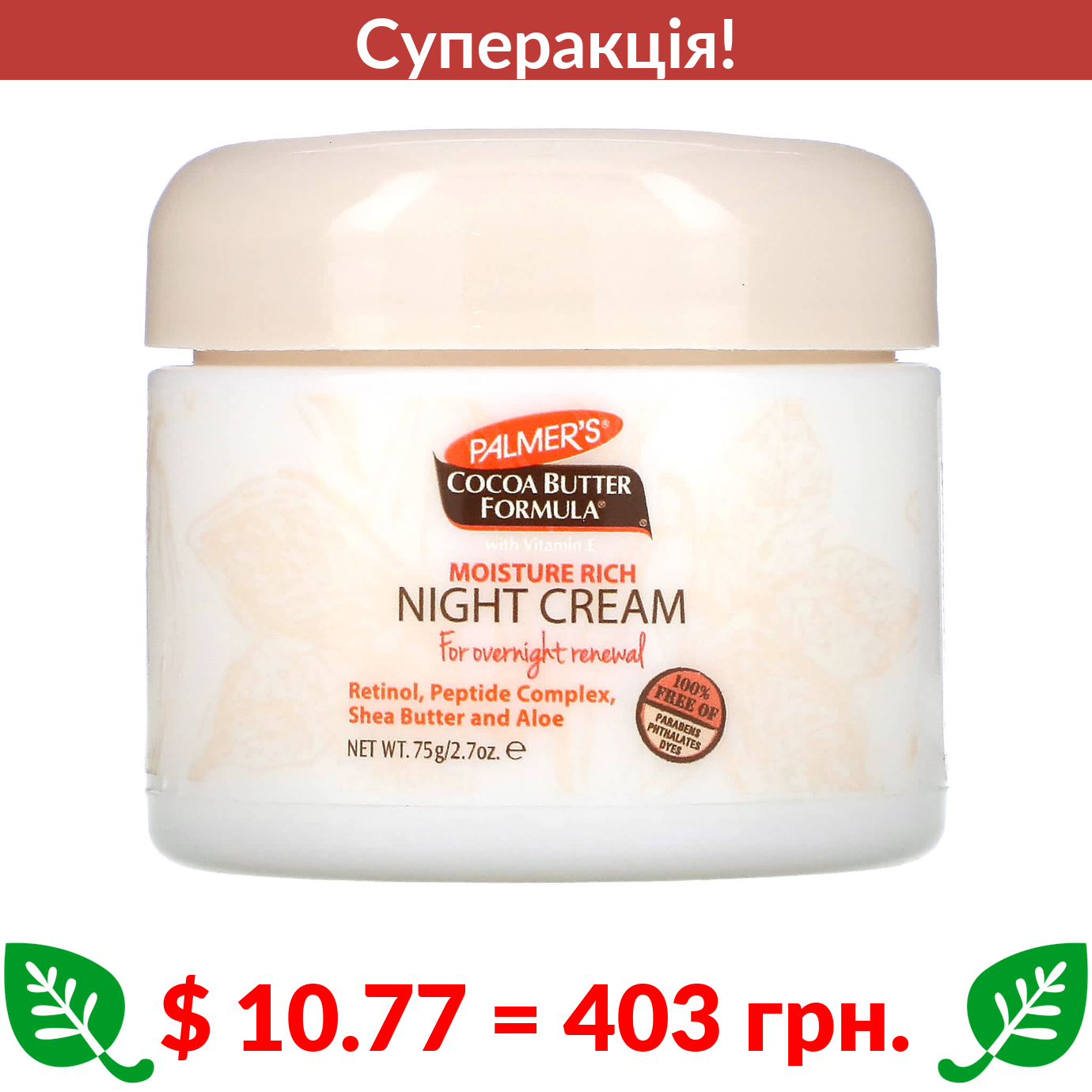 $ 10.77 = 403 Π³ΡΠ½. π₯ cΡΠΏΠ΅ΡΠ°ΠΊΡΡΡ! π₯ Palmers, ΡΠΎΡΠΌΡΠ»Π° Π· ΠΊΠ°ΠΊΠ°ΠΎ-ΠΌΠ°ΡΠ»ΠΎΠΌ, Π½ΡΡΠ½ΠΈΠΈ̆ Π·Π²ΠΎΠ»ΠΎΠΆΡΠ²Π°Π»ΡΠ½ΠΈΠΈ̆ ΠΊΡΠ΅ΠΌ, 75 Π³ (2,7 ΡΠ½ΡΡΡ̈)