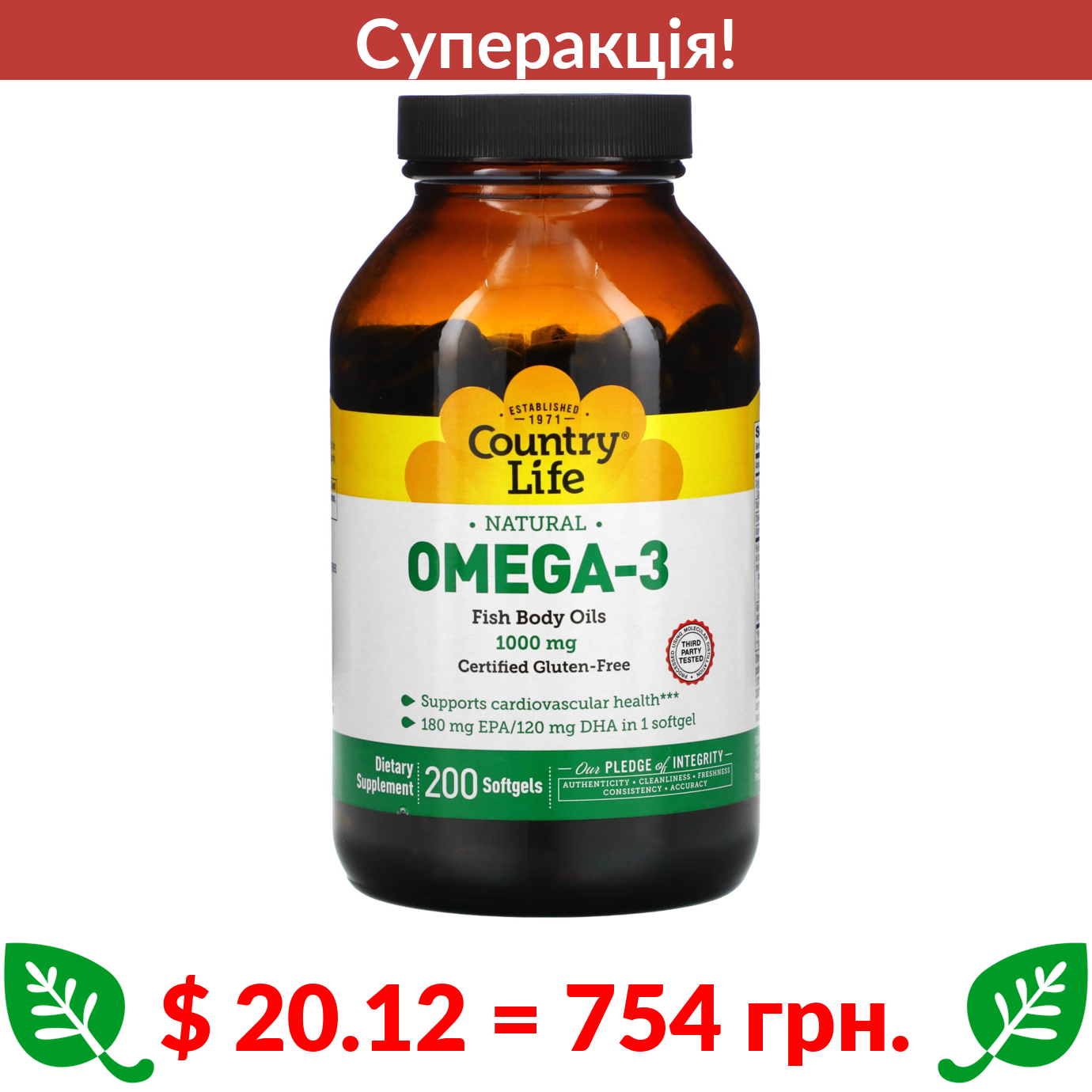 $ 20.12 = 754 Π³ΡΠ½. π₯ cΡΠΏΠ΅ΡΠ°ΠΊΡΡΡ! π₯ Country Life, Π½Π°ΡΡΡΠ°Π»ΡΠ½Π° ΠΎΠΌΠ΅Π³Π°-3, 1000 ΠΌΠ³, 200 ΠΊΠ°ΠΏΡΡΠ»