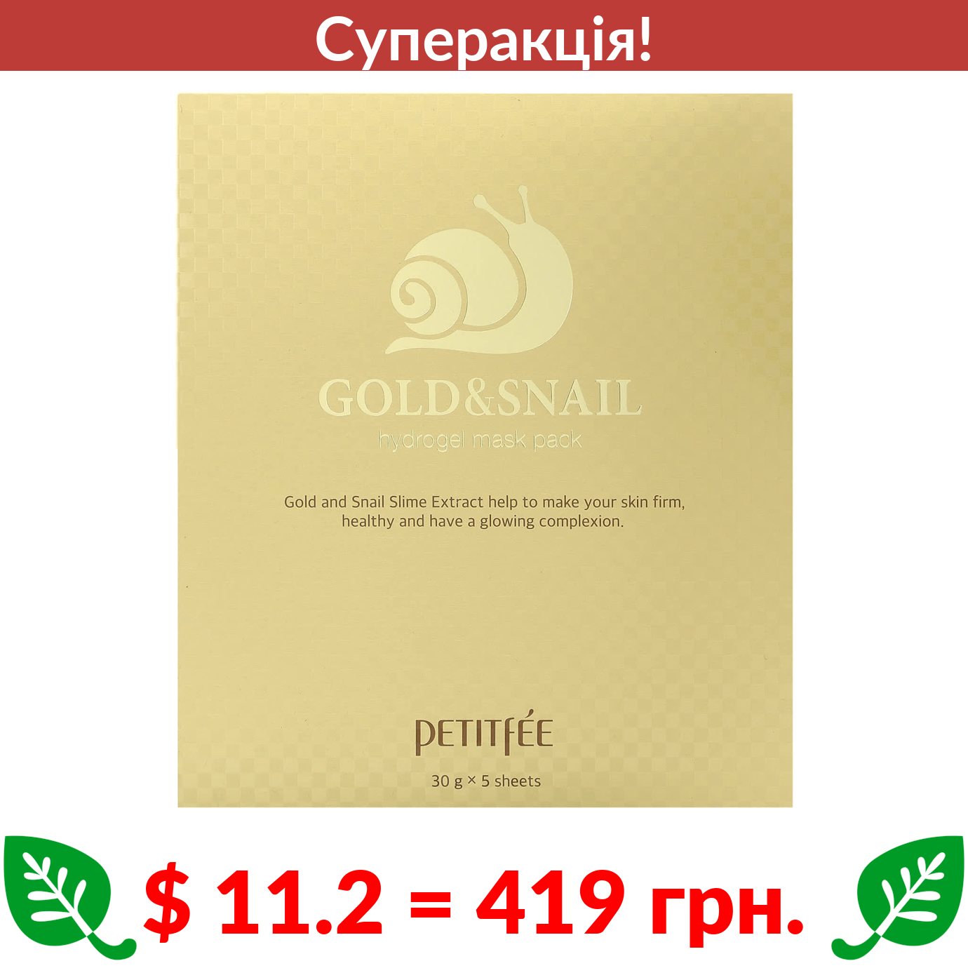 $ 11.2 = 419 Π³ΡΠ½. π₯ cΡΠΏΠ΅ΡΠ°ΠΊΡΡΡ! π₯ Petitfee, Gold & Snail Hydrogel Beauty Mask Pack, 5 Sheets, 30 g Each