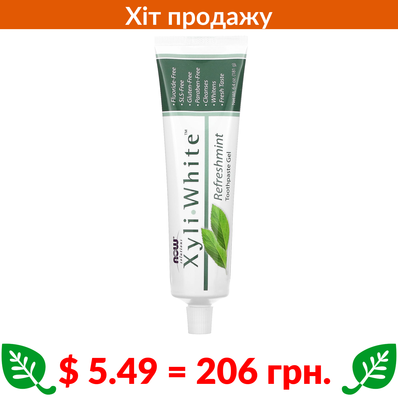 $ 5.49 = 206 Π³ΡΠ½. Now Foods, Solutions, XyliWhite, Π·ΡΠ±Π½Π° ΠΏΠ°ΡΡΠ° Ρ ΡΠΎΡΠΌΡ Π³Π΅Π»Ρ, ΠΎΡΠ²ΡΠΆΠ°ΡΡΠ° ΠΌ'ΡΡΠ°, 181 Π³ (6,4 ΡΠ½ΡΡΡ̈)