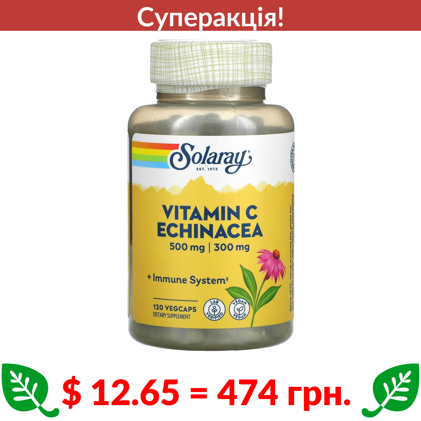 $ 12.65 = 474 Π³ΡΠ½. π₯ cΡΠΏΠ΅ΡΠ°ΠΊΡΡΡ! π₯ Solaray, Vitamin C Echinacea, 500 mg , 120 VegCaps